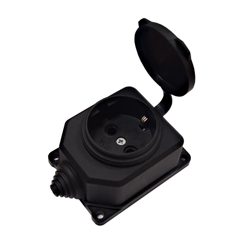 Колодка "UNIVersal" одноместная настенная с заглушками "КОМПАКТ" с/з каучук цвет черный 16А 250В IP44 (еврослот)