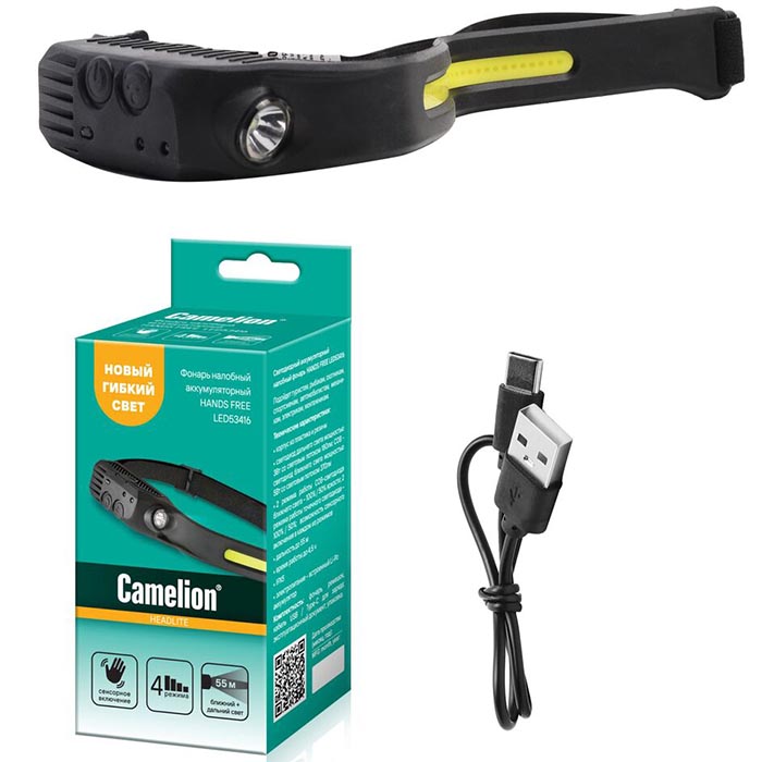 Camelion LED5383 (фонарь налобн, черный, лента каучук. COB+LED, 4 реж, 3XAAA, пласт, рез, сэндвич)