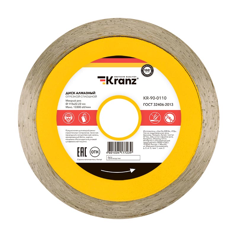 Диск алмазный отрезной сплошной 115x22,2x1,8x10мм KRANZ