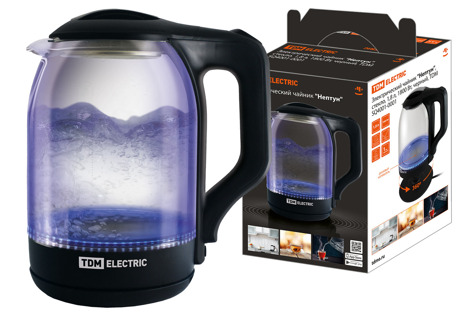 Электрический чайник "Нептун", стекло, 1,8 л, 1800 Вт, черный, TDM